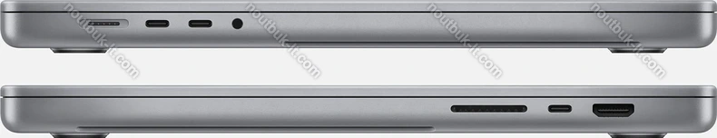 3x Thunderbolt 4 / USB4 с DisplayPort 1.4 (40Gb/s, PD-Out, сетевой разъём питания PD-In), 1x HDMI 2.0, 1x 3.5 мм аудио-разъём, 1x SD Card, 1x DC-In Apple MagSafe 3 (сетевой разъём)
