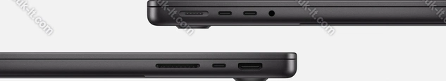 - 3x Thunderbolt 4 / USB4 с DisplayPort 1.4 (40Gb/s, PD-Out, сетевой разъём питания PD-In), 1x HDMI 2.1, 1x 3.5 мм аудио-разъём, 1x SD Card, 1x DC-In Apple MagSafe 3 (сетевой разъём)