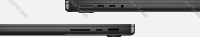 - 3x Thunderbolt 5 / USB4 v2 с DisplayPort 2.1 UHBR20 (80Gb/s, сетевой разъём питания PD-In), 1x HDMI 2.1, 1x 3.5 мм аудио-разъём, 1x SD Card, 1x DC-In Apple MagSafe 3 (сетевой разъём)