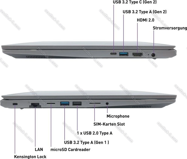 1x USB-C 3.1 с DisplayPort (10Gb/s, PD-Out), 1x USB-A 3.1 (10Gb/s), 1x USB-A 3.0 (5Gb/s), 1x USB-A 2.0 (480Mb/s), 1x HDMI, 1x 3.5 мм аудио-разъём линейный вход/выход, 1x RJ-45 (1000Base-T), 1x microSD, 1x SIM (Nano-SIM), 1x DC-In разъём питания
