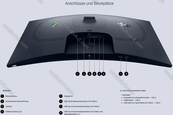 1x DisplayPort 1.4 (HDCP 2.3, 180Hz@2560x1440), 2x HDMI 2.1 (HDCP 2.3, 144Hz@2560x1440), 1x USB-B 3.0 (исходящий, 5Gb/s), 1x USB-A 3.0 (входящий, 5Gb/s, BC), 1x USB-A 3.0 (входящий, 5Gb/s), 1x AC-In C14 (подключение к электросети)
