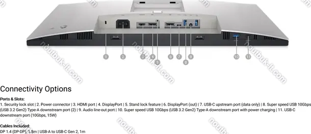 - 1x HDMI 1.4, 1x DisplayPort 1.4, 1x DisplayPort-Out 1.4, 1x USB-C 3.1 (Upstream, 10Gb/s), 1x USB-C 3.1 (downstream, 10Gb/s), 1x USB-A 3.1 (downstream, 10Gb/s, BC), 2x USB-A 3.1 (downstream, 10Gb/s), 1x 3.5mm jack, 1x AC-In C13 (подключение к сети)