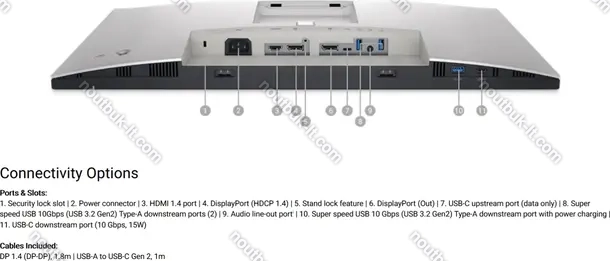 - 1x HDMI 1.4, 1x DisplayPort 1.4, 1x DisplayPort-Out 1.4, 1x USB-C 3.1 (Upstream, 10Gb/s), 1x USB-C 3.1 (downstream, 10Gb/s), 1x USB-A 3.1 (downstream, 10Gb/s, BC), 2x USB-A 3.1 (downstream, 10Gb/s), 1x 3.5mm jack, 1x AC-In C14 (подключение к сети)